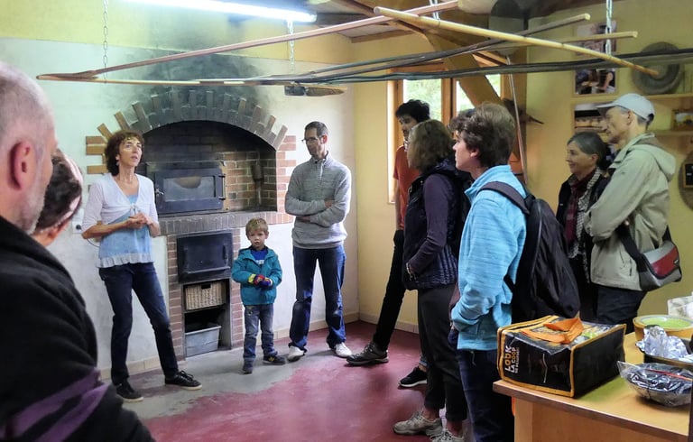 Véronique au fournil nous explique devant le four à bois comment se prépare la fabrication du pain de A Z , les différentes farines employées et broyées dans le moulin sur place.
